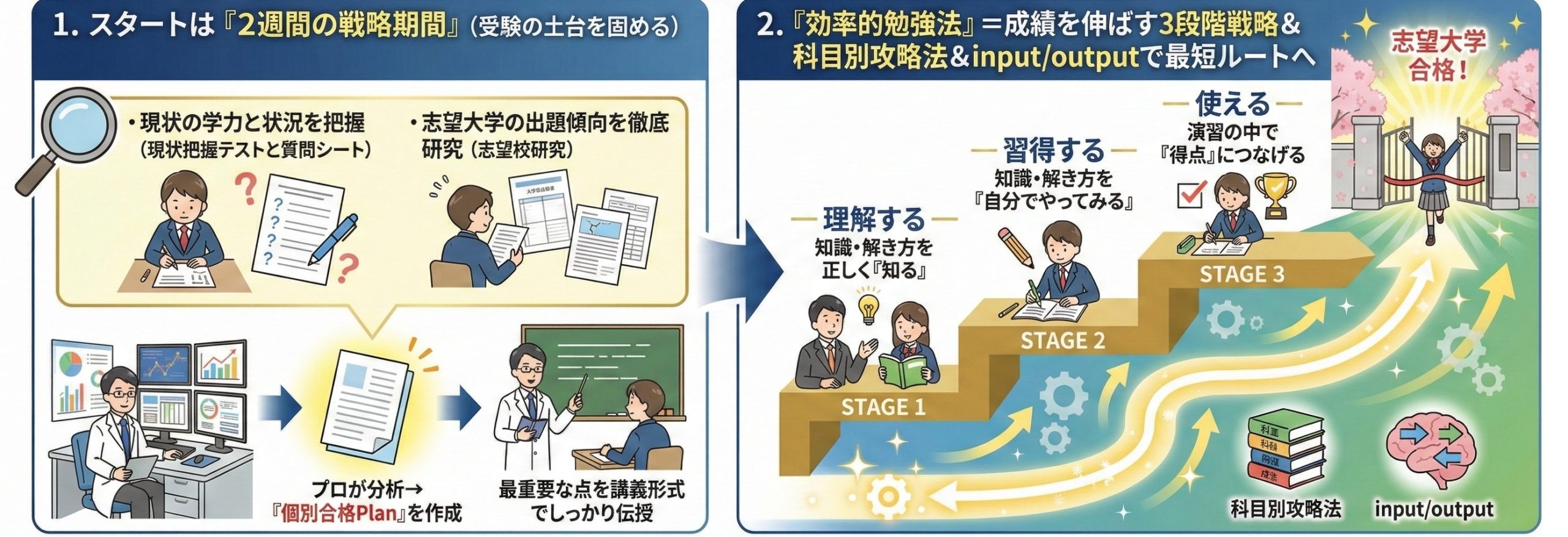 2. 「効率的勉強法」=成績を伸ばす3段階戦略&科目別攻略法&input/outputで最短ルートへ