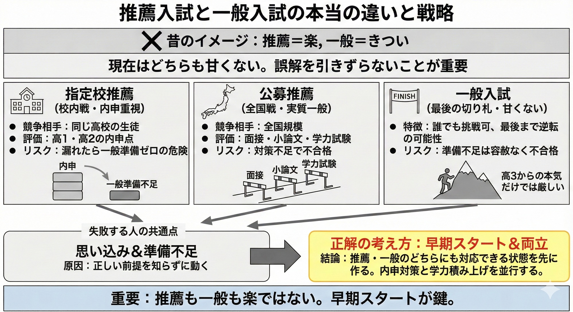 ※推薦が増えた今でも、一般入試の重要性が下がったわけではなく、むしろ、推薦でも共通テストや学力試験が求められるケースが増え、「一般入試で戦える学力」=どのルートでも必要な土台になっています。