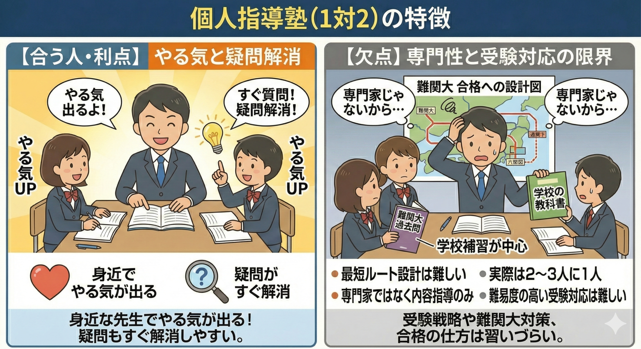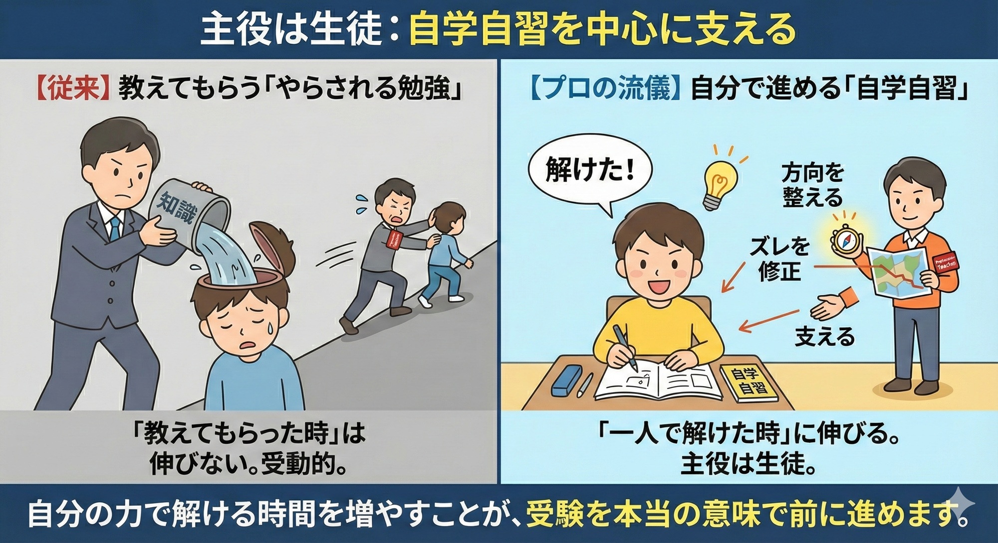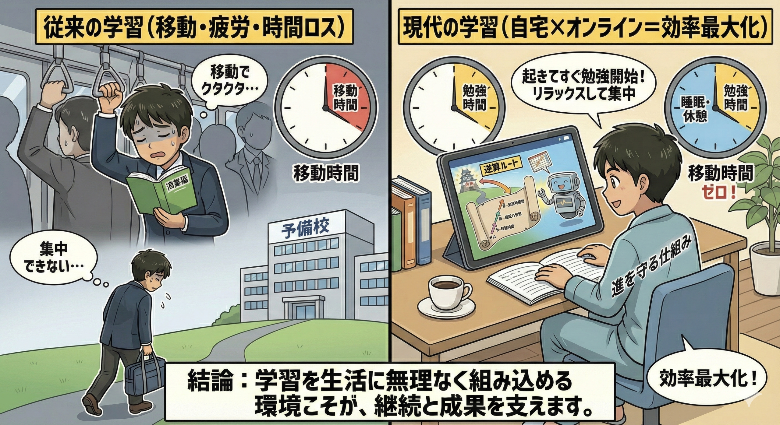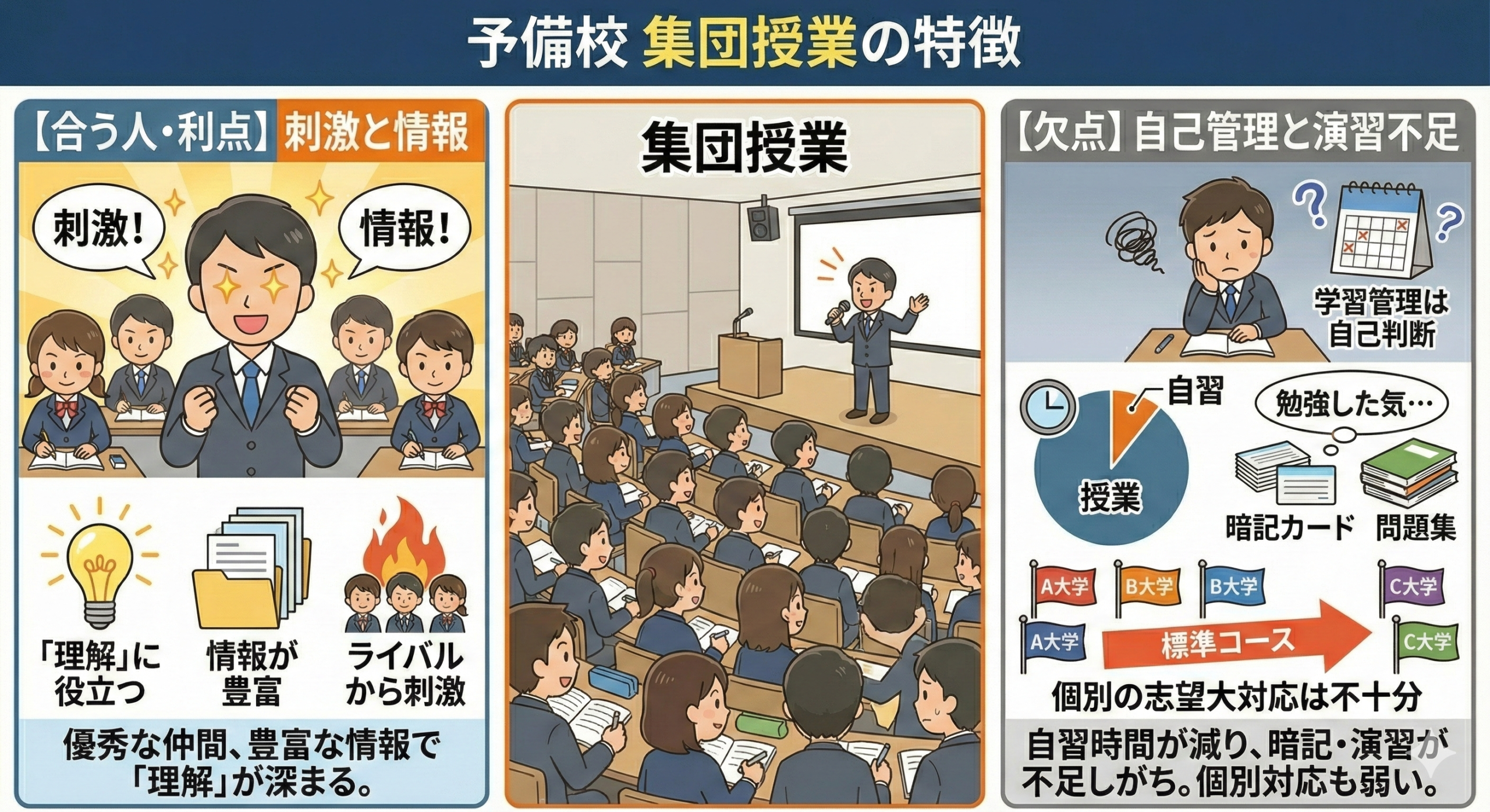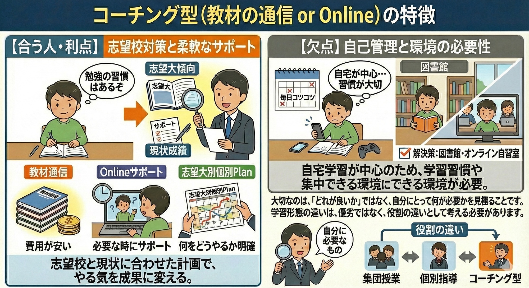 👉 学習形態の違いは、優劣ではなく、役割の違いとして考える必要があります。